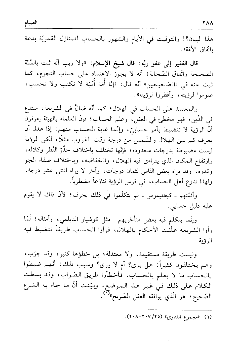 قال الفقير إلى عفو ربه: قال شيخ الإسلام: "ولا ريب أنه ثبت بالسُّنة الصحيحة واتفاق الصَّحابة؛ أنه لا يجوز الاعتماد على حساب النجوم، كما ثبت عنه في "الصَّحيحين" أنه قال: "إنا أُمّة أُمِّية لا نكتب ولا نحسب، صوموا لرؤيته، وأفطروا لرؤيته".