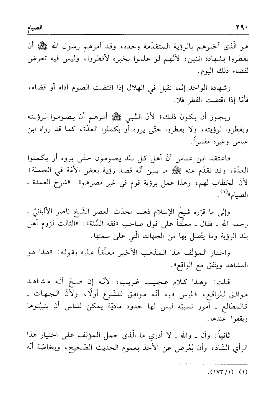 وإلى ما قرّره شيخُ الإسلام ذهب محدث العصر الشيخ ناصر الألباني -رحمه الله- فقال -معلقًا على قول صاحب "فقه السُّنة": "الثالث لزوم أهل بلد الرؤية وما يتصل بها من الجهات التي على سمتها.
