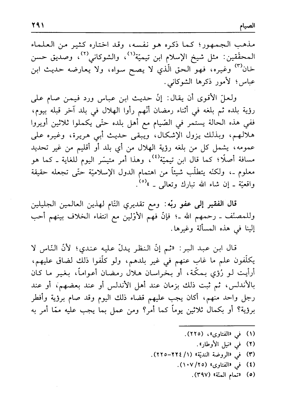 ولعلّ الأقوى أن يقال: إن حديث ابن عباس ورد فيمن صام على رؤية بلده ثم بلغه في أثناء رمضان أنهم رأوا الهلال في بلد آخر قبله بيوم، ففي هذه الحالة يستمر في الصيام مع أهل بلده حتّى يكملوا ثلاثين أو يروا هلالهم، وبذلك يزول الإشكال، ويبقى حديث أبي هريرة، وغيره على عمومه، يشمل كل من بلغه رؤية الهلال من أي بلد أو أقليم من غير تحديد مسافة أصلًا، كما قال ابن تيمية (¬4)، وهذا أمر متيسر اليوم للغاية -كما هو معلوم-، ولكنه يتطلّب شيئًا من اهتمام الدول الإسلامية حتى تجعله حقيقة واقعيّة -إن شاء الله تبارك وتعالى-" (¬5).