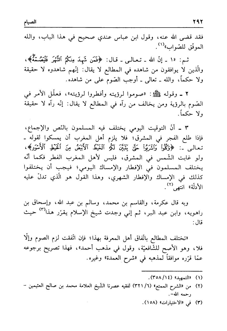 3 - أن التوقيت اليومي يختلف فيه المسلمون بالنص والإجماع، فإذا طلع الفجر في المشرق؛ فلا يلزم أهل المغرب أن يمسكوا لقوله -تعالى-: {وَكُلُوا وَاشْرَبُوا حَتَّى يَتَبَيَّنَ لَكُمُ الْخَيْطُ الْأَبْيَضُ مِنَ الْخَيْطِ الْأَسْوَدِ}، ولو غابت الشمس في المشرق، فليس لأهل المغرب الفطر فكما أنه يختلف المسلمون في الإفطار والإمساك اليومي؛ فيجب أن يختلفوا كذلك في الإمساك والإفطار الشهري، وهذا القول هو الذي تدل عليه الأدلة" انتهى (¬2).