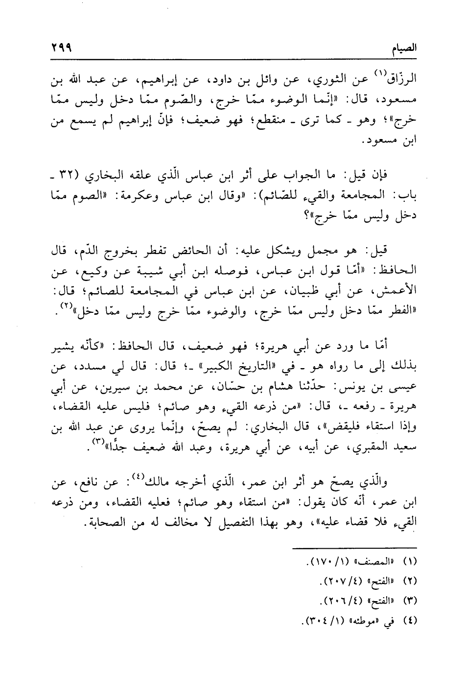 الرزاق (¬1) عن الثوري، عن وائل بن داود، عن إبراهيم، عن عبد الله بن مسعود، قال: "إنما الوضوء مما خرج، والصوم مما دخل وليس مما خرج"؛ وهو -كما ترى- منقطع؛ فهو ضعيف؛ فإنّ إبراهيم لم يسمع من ابن مسعود.