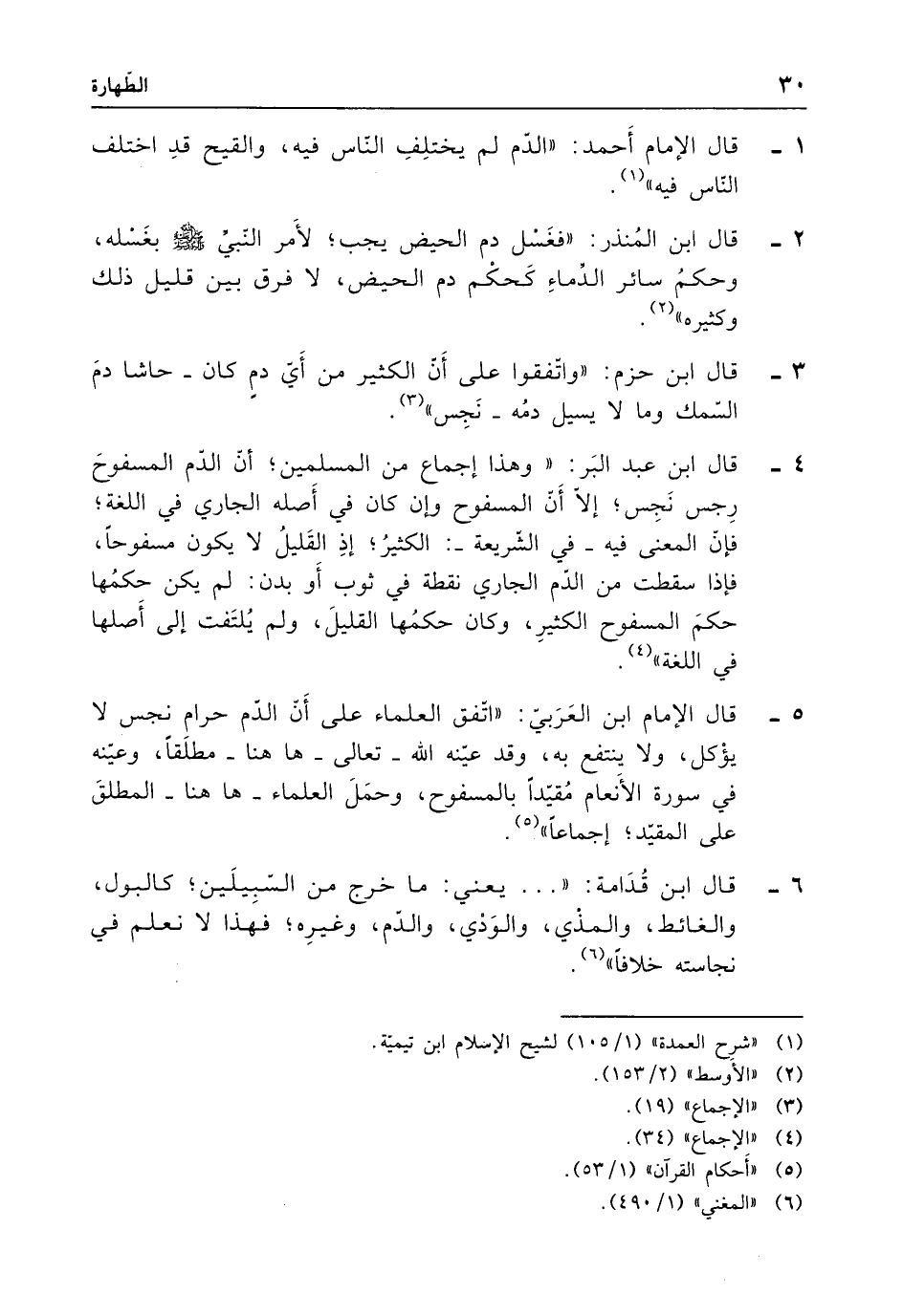1 - قال الإمام أَحمد "الدّم لم يختلِفِ الناس فيه، والقيح قدِ اختلف النَّاس فيه" (¬1).