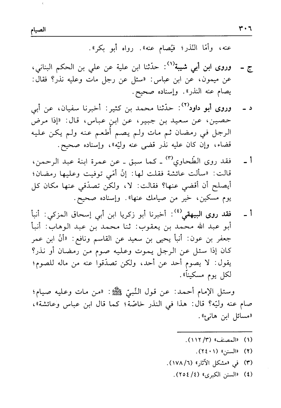 ج- وروى ابن أبي شيبة (¬1): حدَّثنا ابن علية عن علي بن الحكم البناني، عن ميمون، عن ابن عباس: "سئل عن رجل مات وعليه نذر؟ فقال: يصام عنه النذر". وإسناده صحيح.