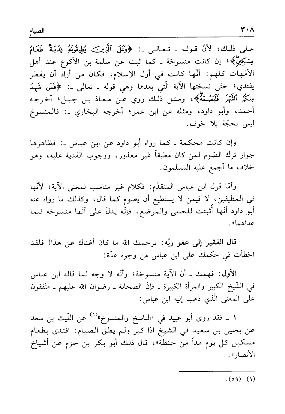 الأول: فهمك -أن الآية منسوخة؛ وأنّه لا وجه لما قاله ابن عباس في الشيخ الكبير والمرأة الكبيرة - فإن الصحابة - رضوان الله عليهم - متفقون على المعنى الذي ذهب إليه ابن عباس: