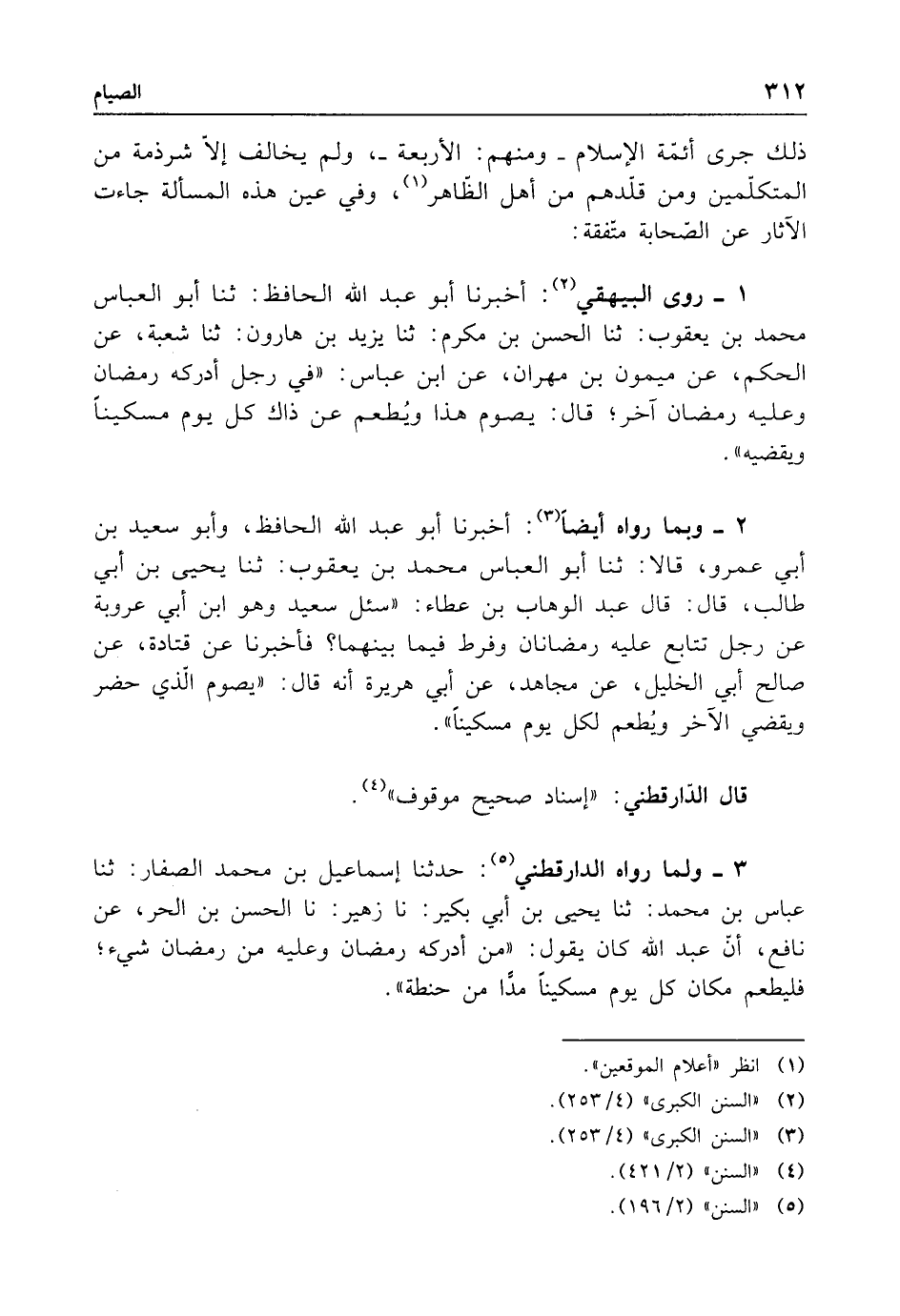 2 - وبما رواه أيضًا (¬3): أخبرنا أبو عبد الله الحافظ، وأبو سعيد بن أبي عمرو، قالا: ثنا أبو العباس محمد بن يعقوب: ثنا يحيى بن أبي طالب، قال: قال عبد الوهاب بن عطاء: "سئل سعيد وهو ابن أبي عروبة عن رجل تتابع عليه رمضانان وفرط فيما بينهما؟ فأخبرنا عن قتادة، عن صالح أبي الخليل، عن مجاهد، عن أبي هريرة أنه قال: "يصوم الّذي حضر ويقضي الآخر ويُطعم لكل يوم مسكينًا".
