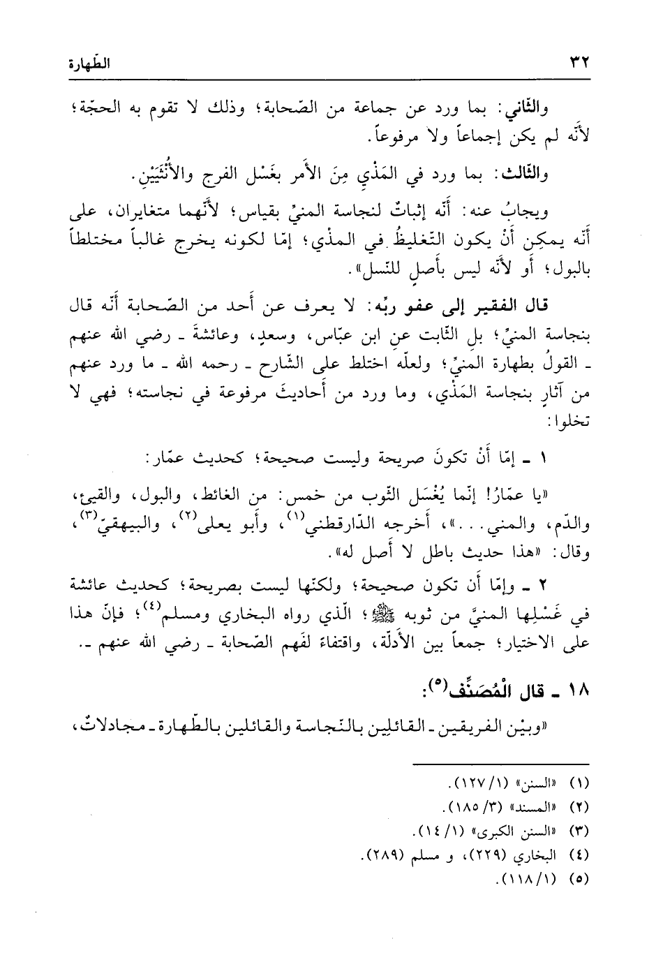 قال الفقير إلى عفو ربّه: لا يعرف عن أَحد من الصحابة أنَّه قال بنجاسة المني؛ بلِ الثابت عنِ ابن عبّاس، وسعدِ، وعائشةَ - رضي الله عنهم - القولُ بطهارة المنى؛ ولعلّه اختلط على الشارح -رحمه الله- ما ورد عنهم من آثارِ بنجاسة المَذْي، وما ورد من أَحاديثَ مرفوعة في نجاسته؛ فهي لا تخلوا: