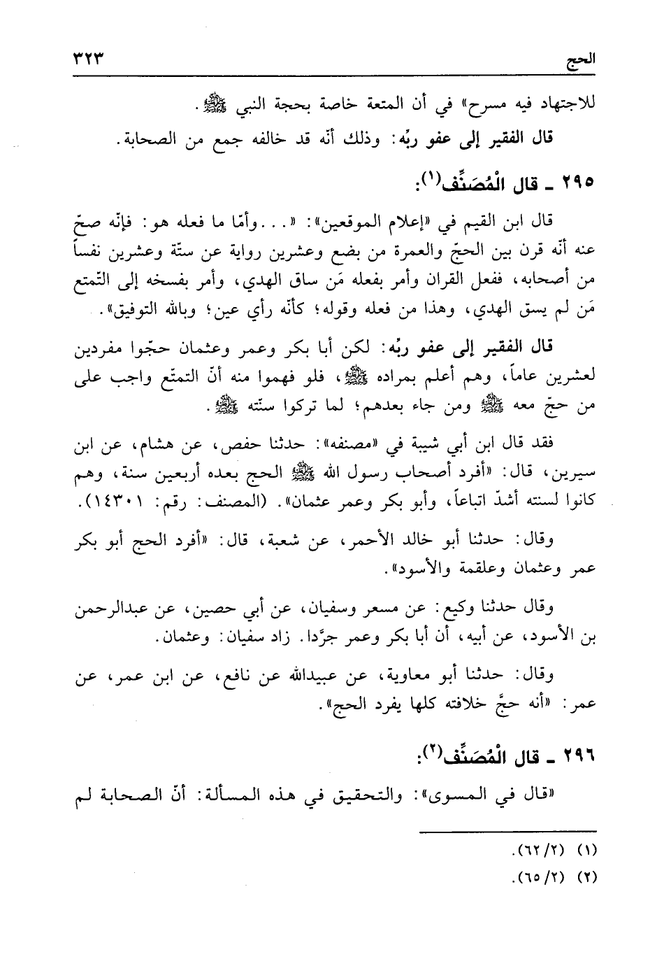 قال الفقير إلى عفو ربِّه: لكن أبا بكر وعمر وعثمان حجّوا مفردين لعشرين عامًا، وهم أعلم بمراده - صلى الله عليه وسلم -، فلو فهموا منه أنّ التمتع واجب على من حجّ معه - صلى الله عليه وسلم - ومن جاء بعدهم؛ لما تركوا سنّته - صلى الله عليه وسلم -.
