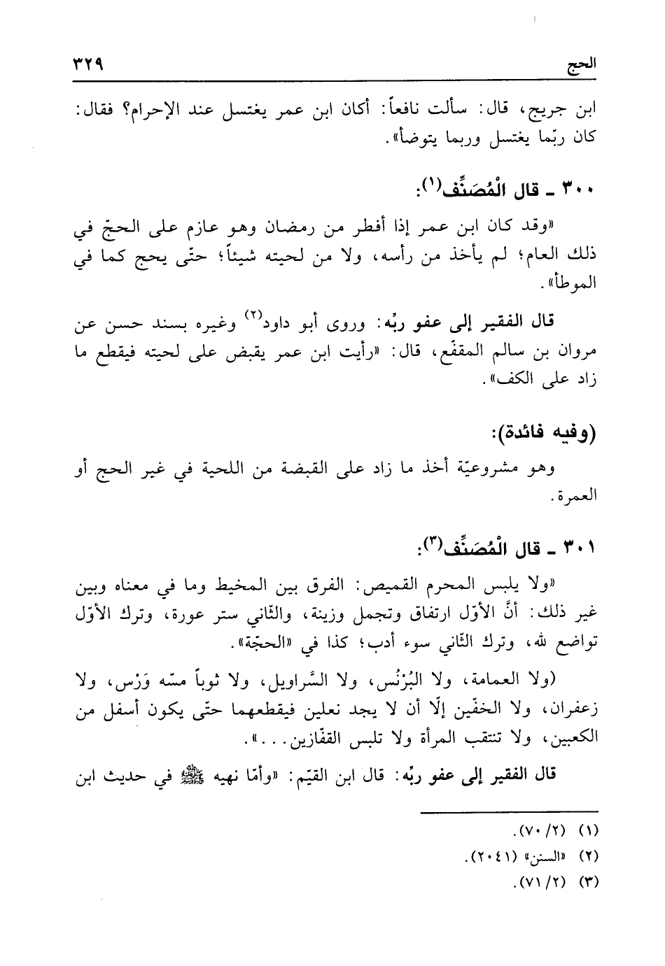 "وقد كان ابن عمر إذا أفطر من رمضان وهو عازم على الحجّ في ذلك العام؛ لم يأخذ من رأسه، ولا من لحيته شيئًا؛ حتى يحج كما في الموطأ".