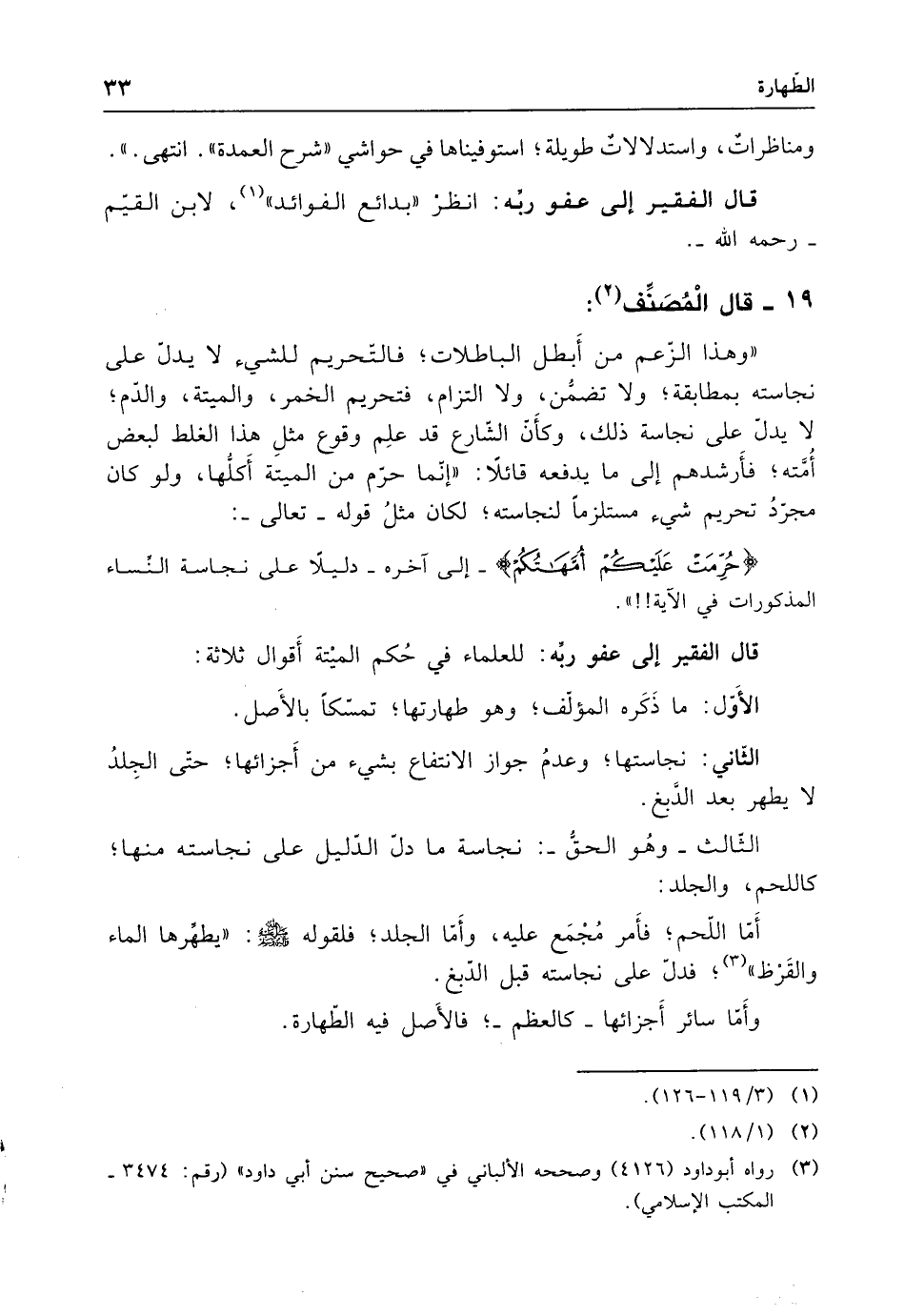 "وهذا الزّعم من أَبطل الباطلات؛ فالتحريم للشيء لا يدلّ على نجاسته بمطابقة؛ ولا تضمُّن، ولا التزام، فتحريم الخمر، والميتة، والدّم؛ لا يدلّ على نجاسة ذلك، وكأَن الشَّارع قد علِم وقوع مثلِ هذا الغلط لبعض أُمَّته؛ فأَرشدهم إلى ما يدفعه قائلًا: "إنما حرّم من الميتة أَكلُّها، ولو كان مجردُ تحريم شيء مستلزمًا لنجاسته؛ لكان مثلُ قوله -تعالى-: