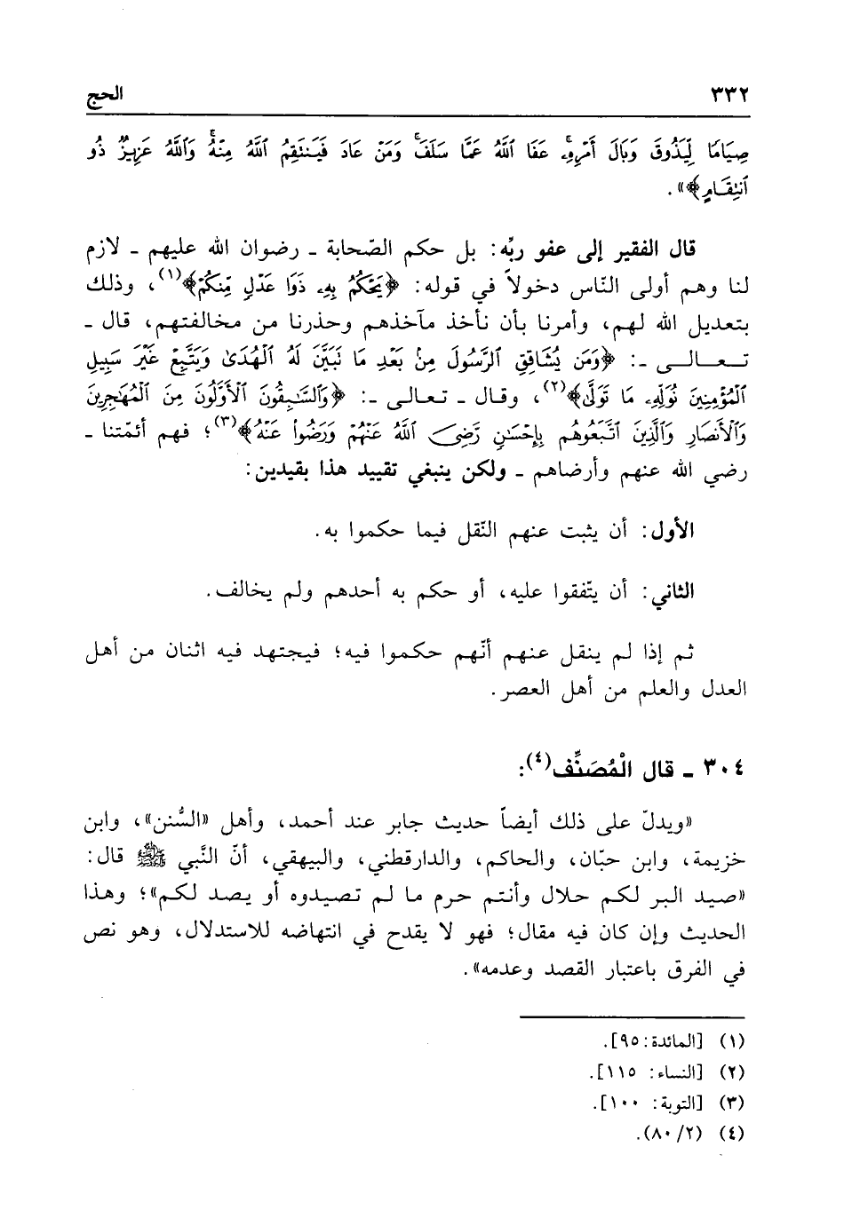 قال الفقير إلى عفو ربِّه: بل حكم الصّحابة - رضوان الله عليهم - لازم لنا وهم أولى النّاس دخولًا في قوله: {يَحْكُمُ بِهِ ذَوَا عَدْلٍ مِنْكُمْ} (¬1)، وذلك بتعديل الله لهم، وأمرنا بأن نأخذ مآخذهم وحذرنا من مخالفتهم، قال - تعالى -: {وَمَنْ يُشَاقِقِ الرَّسُولَ مِنْ بَعْدِ مَا تَبَيَّنَ لَهُ الْهُدَى وَيَتَّبِعْ غَيْرَ سَبِيلِ الْمُؤْمِنِينَ نُوَلِّهِ مَا تَوَلَّى} (¬2)، وقال - تعالى -: {وَالسَّابِقُونَ الْأَوَّلُونَ مِنَ الْمُهَاجِرِينَ وَالْأَنْصَارِ وَالَّذِينَ اتَّبَعُوهُمْ بِإِحْسَانٍ رَضِيَ اللَّهُ عَنْهُمْ وَرَضُوا عَنْهُ} (¬3)؛ فهم أئمّتنا - رضي الله عنهم وأرضاهم - ولكن ينبغي تقييد هذا بقيدين: