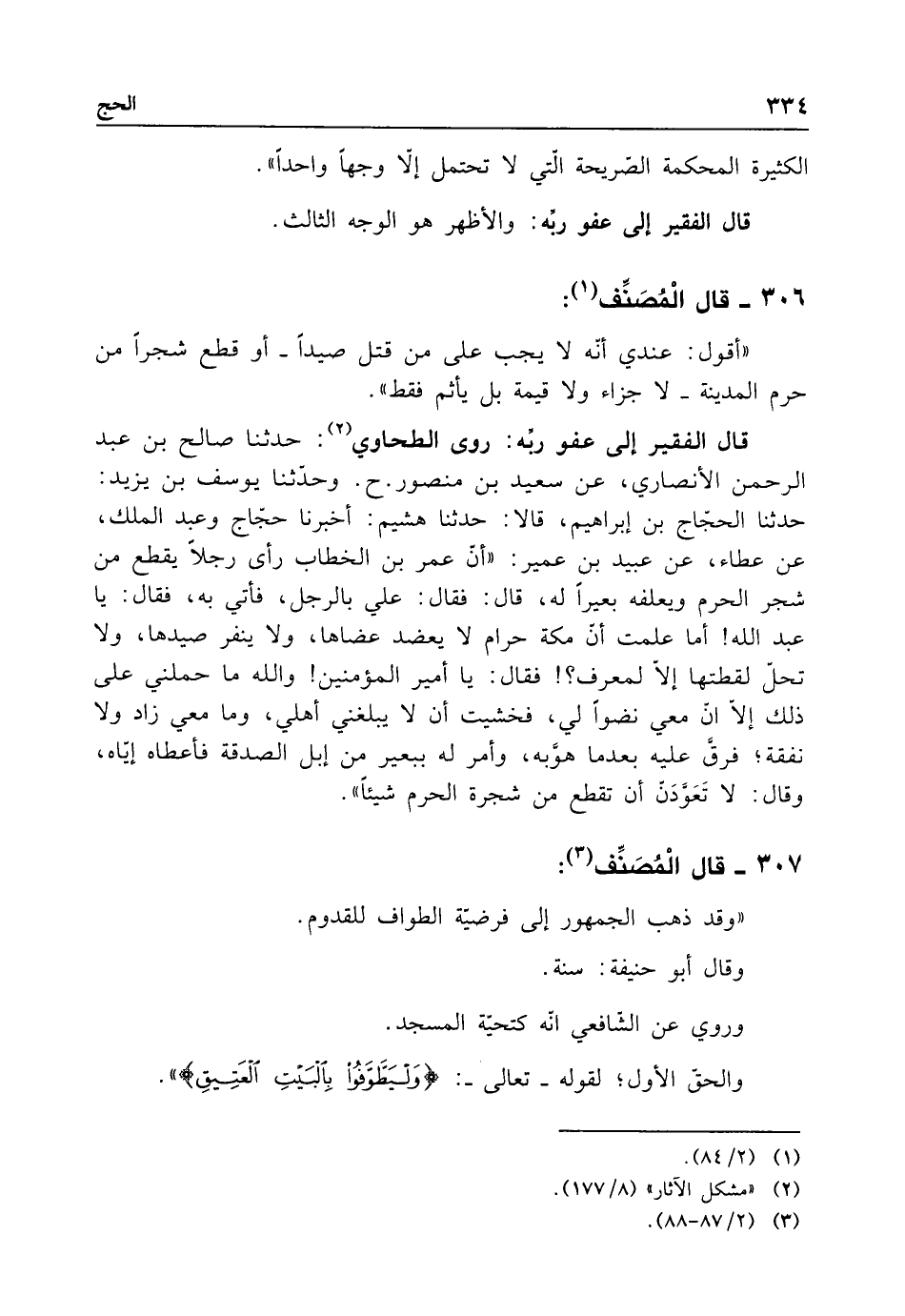 قال الفقير إلى عفو ربِّه: روى الطحاوي (¬2): حدثنا صالح بن عبد الرحمن الأنصاري، عن سعيد بن منصور. ح. وحدّثنا يوسف بن يزيد: حدثنا الحجّاج بن إبراهيم، قالا: حدثنا هشيم: أخبرنا حجّاج وعبد الملك، عن عطاء، عن عبيد بن عمير: "أنّ عمر بن الخطاب رأى رجلًا يقطع من شجر الحرم ويعلفه بعيرًا له، قال: فقال: علي بالرجل، فأتي به، فقال: يا عبد الله! أما علمت أنّ مكة حرام لا يعضد عضاها، ولا ينفر صيدها، ولا تحل لقطتها إلّا لمعرف؟! فقال: يا أمير المؤمنين! والله ما حملني على ذلك إلّا أنّ معي نضوًا لي، فخشيت أن لا يبلغني أهلي، وما معي زاد ولا نفقة؛ فرقَّ عليه بعدما هوَّبه، وأمر له ببعير من إبل الصدقة فأعطاه إيّاه، وقال: لا تَعَوَّدَن أن تقطع من شجرة الحرم شيئًا".