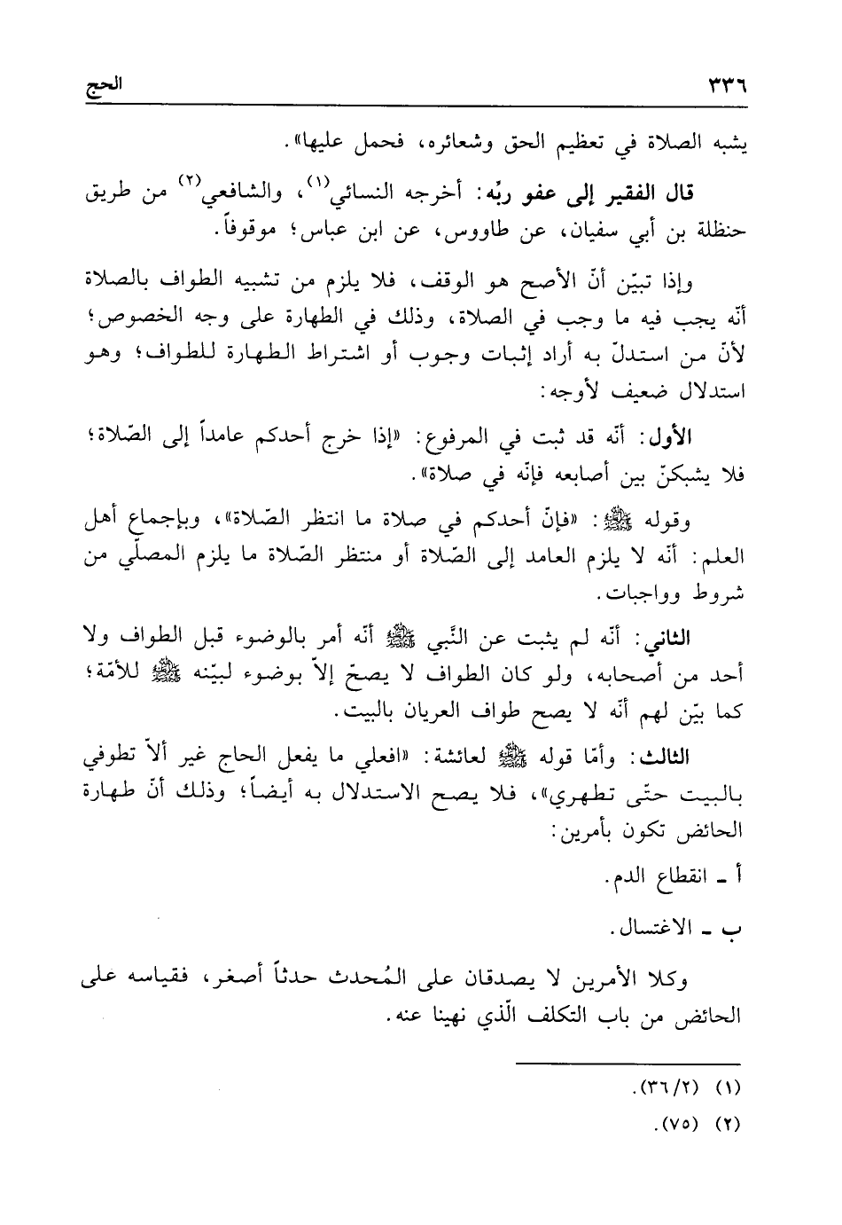 وإذا تبيّن أنّ الأصح هو الوقف، فلا يلزم من تشبيه الطواف بالصلاة أنّه يجب فيه ما وجب في الصلاة، وذلك في الطهارة على وجه الخصوص؛ لأنّ من استدلّ به أراد إثبات وجوب أو اشتراط الطهارة للطواف؛ وهو استدلال ضعيف لأوجه: