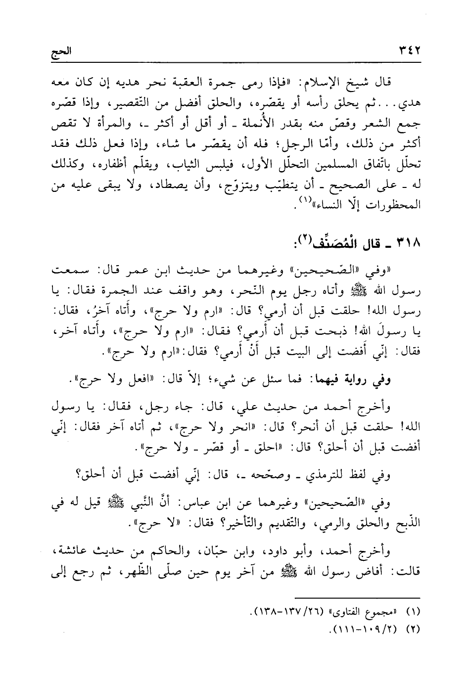 وفي "الصّحيحين" وغيرهما عن ابن عباس: أن النَّبيّ - صلى الله عليه وسلم - قيل له في الذّبح والحلق والرمي، والتّقديم والتأخير؟ فقال: "لا حرج".