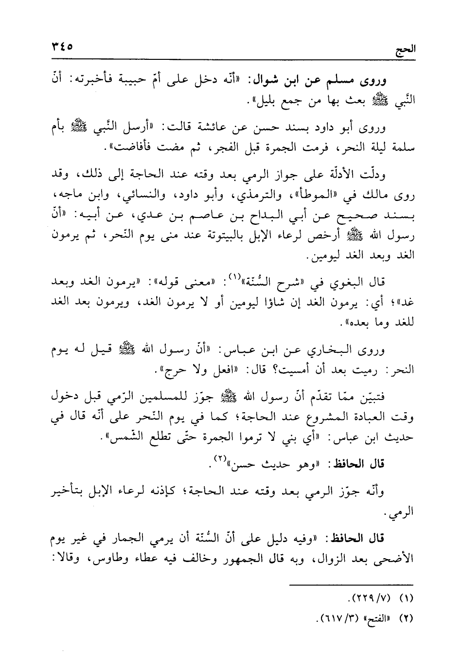 وروى أبو داود بسند حسن عن عائشة قالت: "أرسل النَّبيّ - صلى الله عليه وسلم - بأم سلمة ليلة النحر، فرمت الجمرة قبل الفجر، ثم مضت فأفاضت".