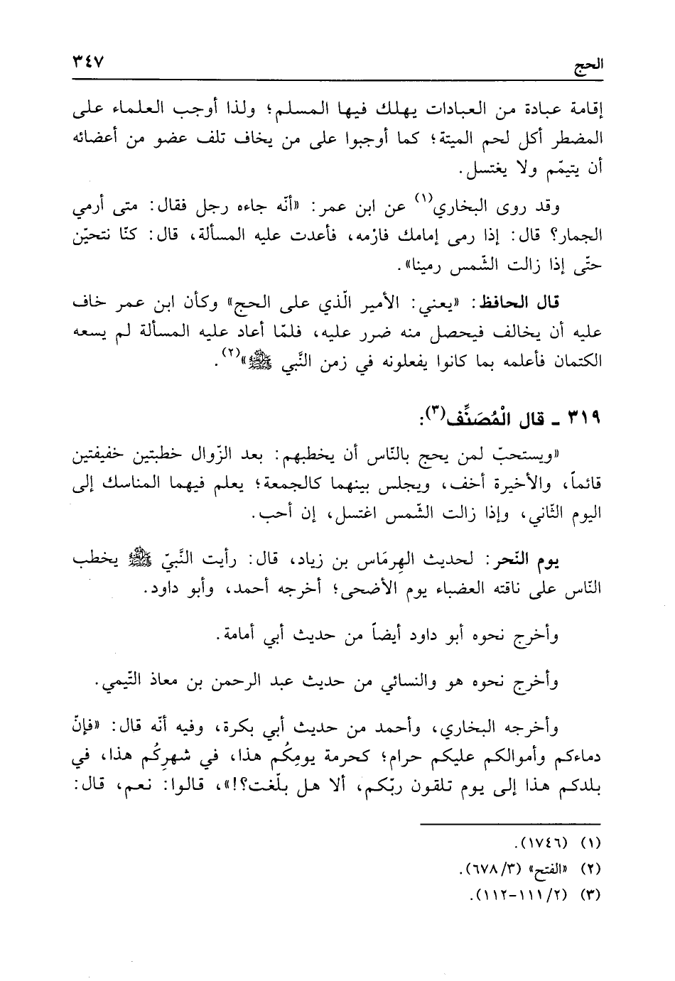 وأخرجه البخاري، وأحمد من حديث أبي بكرة، وفيه أنّه قال: "فإنّ دماءكم وأموالكم عليكم حرام؛ كحرمة يومِكُم هذا، في شهرِكُم هذا، في بلدكم هذا إلى يوم تلقون ربّكم، ألا هل بلّغت؟! "، قالوا: نعم، قال:
