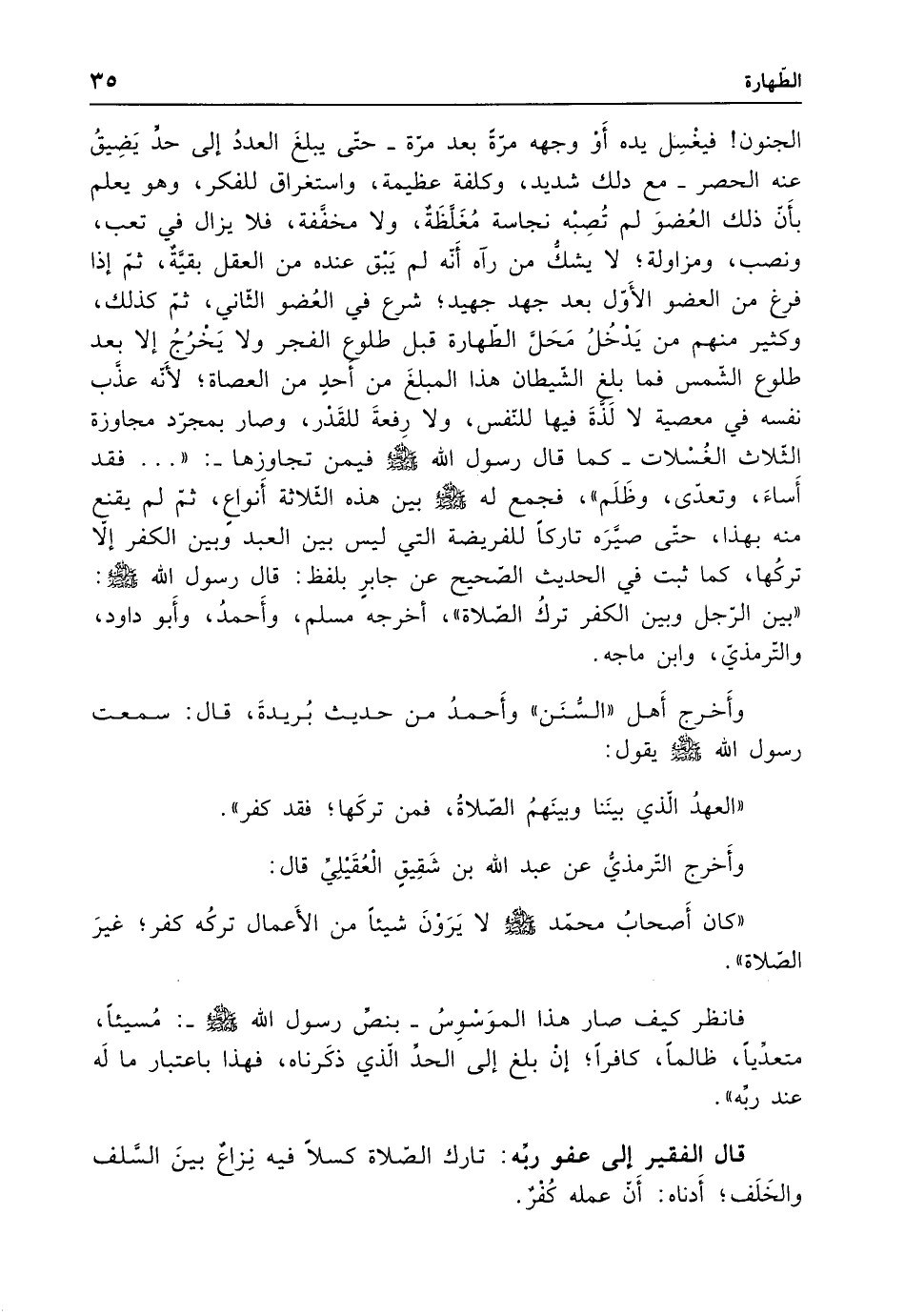 الجنون! فيغْسِل يده أَوْ وجهه مرّةً بعد مرة -حتّى يبلغَ العددُ إلى حدّ يَضِيقُ عنه الحصر- مع دلك شديد، وكلفة عظيمة، واستغراق للفكر، وهو يعلم بأنّ ذلك العُضوَ لم تُصبْه نجاسة مُغَلظَةٌ، ولا مخفَّفة، فلا يزال في تعب، ونصب، ومزاولة؛ لا يشك من رآه أَنّه لم يَبْق عنده من العقل بقيَّة، ثمَّ إذا فرغ من العضو الأَوّل بعد جهد جهيد؛ شرع في العُضو الثّاني، ثمّ كذلك، وكثير منهم من يَدخُلُ مَحَلَّ الطهارة قبل طلوع الفجر ولا يَخرُجُ إلا بعد طلوع الشمس فما بلغ الشيطان هذا المبلغَ من أحدِ من العصاة؛ لأَنه عذب نفسه في معصية لا لَذةَ فيها للنّفس، ولا رِفعةَ للقَدر، وصار بمجرّد مجاوزة الثلاث الغُسْلات -كما قال رسول الله - صلى الله عليه وسلم - فيمن تجاوزها-: " ... فقد أَساءَ، وتعدّى، وظَلَم"، فجمع له - صلى الله عليه وسلم - بين هذه الثلاثة أَنواع، ثمّ لم يقنع منه بهذا، حتّى صيرَه تاركًا للفريضة التي ليس بين العبد وبين الكفر إلَّا تركُها، كما ثبت في الحديث الصحيح عن جابرٍ بلفظ: قال رسول الله - صلى الله عليه وسلم -: "بين الرجل وبين الكفر تركُ الصلاة"، أخرجه مسلم، وأَحمدُ، وأَبو داود، والتّرمذي، وابن ماجه.