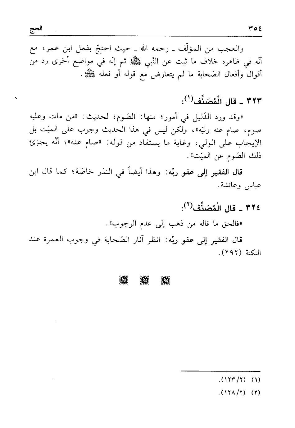 والعجب من المؤلف -رحمه الله- حيث احتجّ بفعل ابن عمر، مع أنّه في ظاهره خلاف ما ثبت عن النَّبيّ - صلى الله عليه وسلم - ثم إنّه في مواضع أخرى رد من أقوال وأفعال الصّحابة ما لم يتعارض مع قوله أو فعله - صلى الله عليه وسلم -.