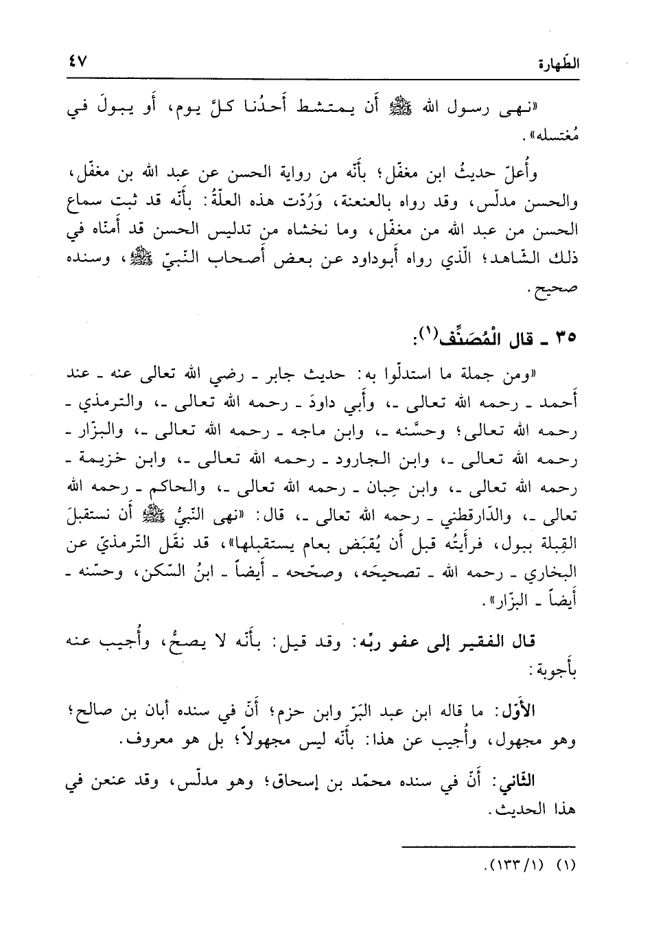 وأُعلّ حديثُ ابن مغفل؛ بأَنه من رواية الحسن عن عبد الله بن مغفّل، والحسن مدلّس، وقد رواه بالعنعنة، وَرُدّت هذه العلّةُ: بأَنّه قد ثبت سماع الحسن من عبد الله من مغفل، وما نخشاه من تدليس الحسن قد أَمنّاه في ذلك الشّاهد؛ الذي رواه أَبو داود عن بعض أَصحاب النبي - صلى الله عليه وسلم -، وسنده صحيح.