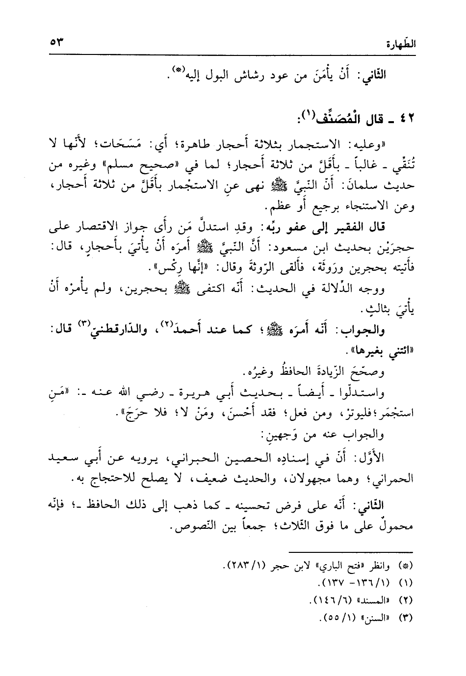قال الفقير إلى عفو ربِّه: وقدِ استدل مَن رأَى جواز الاقتصار على حجرَين بحديث ابن مسعود: أَن النَّبيَّ - صلى الله عليه وسلم - أَمرَه أَن يَأتيَ بأحجارٍ، قال: فأَتيته بحجرين ورَوثَة، فأَلقى الرّوثةَ وقال: "إنّها رِكس".