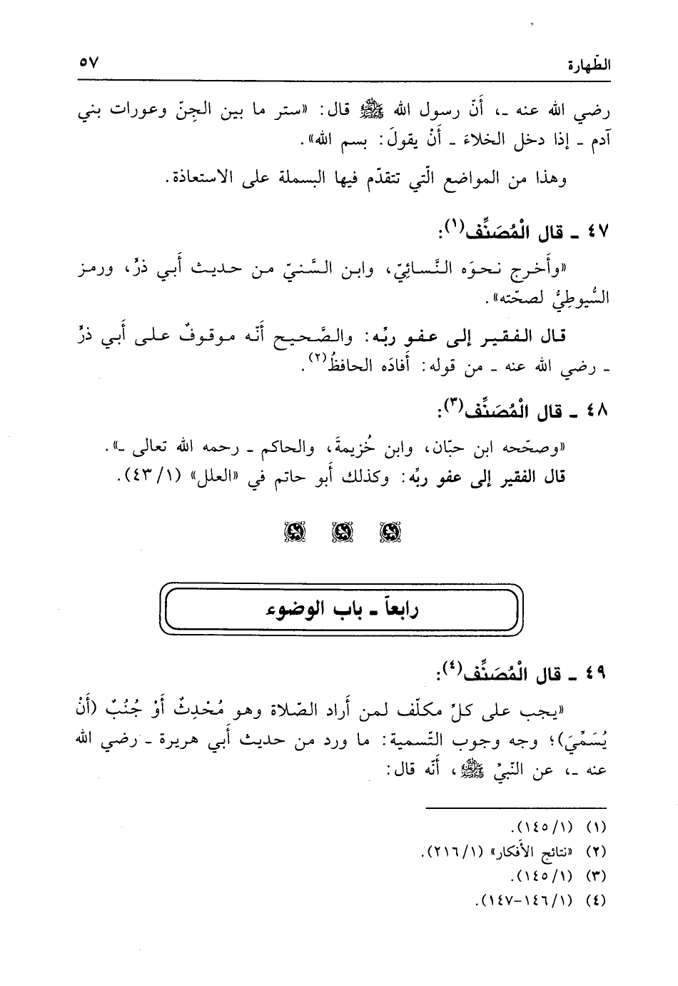 "يجب على كلِّ مكلّف لمن أَراد الصَّلاة وهو مُحدِثٌ أَوْ جُنُبٌ (أَنْ يُسَمِّيَ)؛ وجه وجوب التسمية: ما ورد من حديث أَبي هريرة - رضي الله عنه-، عن النَّبيِّ - صلى الله عليه وسلم -، أَنّه قال: