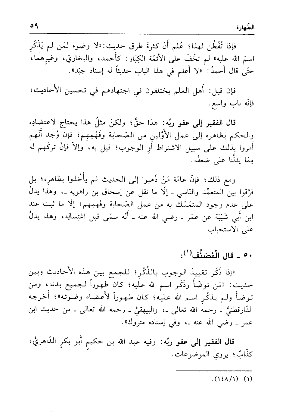 "إذا ذَكَر تقييدَ الوجوب بالذكْرِ؛ للجمع بين هذه الأَحاديث وبين حديث: "مَن توضأَ وذَكَر اسم الله عليه؛ كان طهورًا لجميع بدنه، ومن توضأَ ولم يذكُرِ اسم الله عليه؛ كان طهورًا لأَعضاء وضوئه"؛ أَخرجه الدّارقطنيّ -رحمه الله تعالى-، والبيهقيّ -رحمه الله تعالى- من حديث ابن عمر - رضي الله عنه -، وفي إسناده متروك".