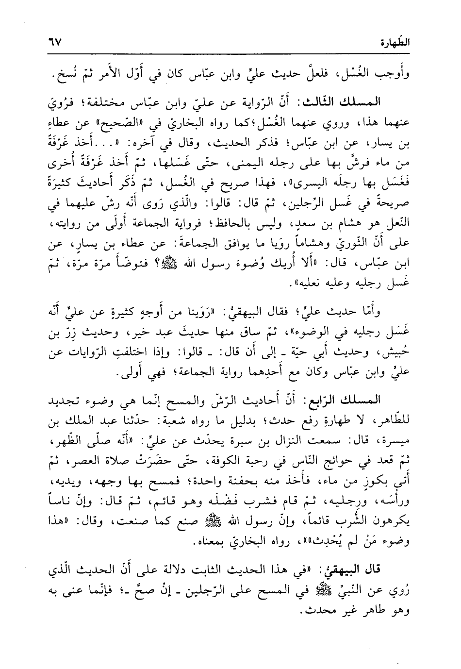 المسلك الثالث: أَن الرّواية عن عليٍّ وابن عبَّاس مختلفة؛ فرُويَ عنهما هذا، وروي عنهما الغُسل؛ كما رواه البخاريّ في "الصَّحيح" عن عطاءِ بن يسار، عن ابن عبَّاس؛ فذكر الحديث، وقال في آخره: " ... أَخذ غَرْفَةَ من ماء فرشَّ بها على رجله اليمنى، حتَّى غَسَلها، ثمّ أَخذ غَرْفَة أُخرى فَغَسَل بها رجلَه اليسرى"، فهذا صريح في الغُسل، ثمّ ذَكَر أَحاديثَ كثيرَةً صريحةً في غَسل الرِّجلين، ثمّ قال: قالوا: والّذي رَوى أَنَّه رشَّ عليهما في النَّعل هو هشام بن سعدٍ، وليس بالحافظ، فرواية الجماعة أَولَى من روايته، على أَن الثوريّ وهشامًا روَيا ما يوافق الجماعةَ: عن عطاء بن يسارٍ، عن ابن عبَّاس، قال: "أَلا أُريك وُضوءَ رسول الله - صلى الله عليه وسلم -؟ فتوضأَ مرَّة مرَّة، ثمّ غَسل رجليه وعليه نعليه".