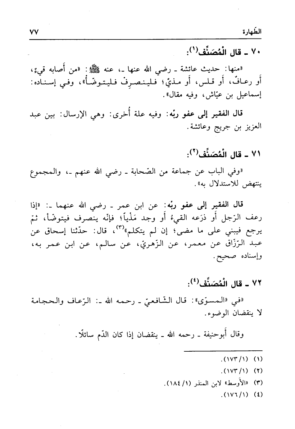قال الفقير إلى عفو ربِّه: عن ابن عمر - رضي الله عنهما -: "إذا رعف الرَّجل أَو ذرَعه القيءُ أَو وجد مَذيًا؛ فإنّه ينصرف فيتوضّأ، ثمّ يرجع فيبني على ما مضى؛ إن لم يتكلم" (¬3)، قال: حدَّثنا إسحاق عن عبد الرّزاق عن معمر، عن الزُّهريّ، عن سالم، عن ابن عمر به، وإسناده صحيح.