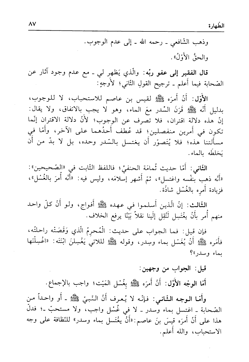 الأوّل: أَن أَمرَه - صلى الله عليه وسلم - لقيس بن عاصم للاستحباب، لا للوجوب، بدليل أَنه - صلى الله عليه وسلم - قَرَنَ السِّدر معَ الماء، وهو لا يجب بالاتفاق، ولا يقال: إنّ هذه دلالة اقتران، فلا تصرَّف عن الوجوب؛ لأَنّ دلالة الاقتران إنَّما تكون في أَمرين منفصلين؛ قد عُطف أَحدُهما على الآخر، وأَمّا في مسأَلتنا هذه؛ فلا يُتَصوّر أَن يغتسل بالسّدر وحده، بل لا بدّ من أَن يَخلطَه بالماء.