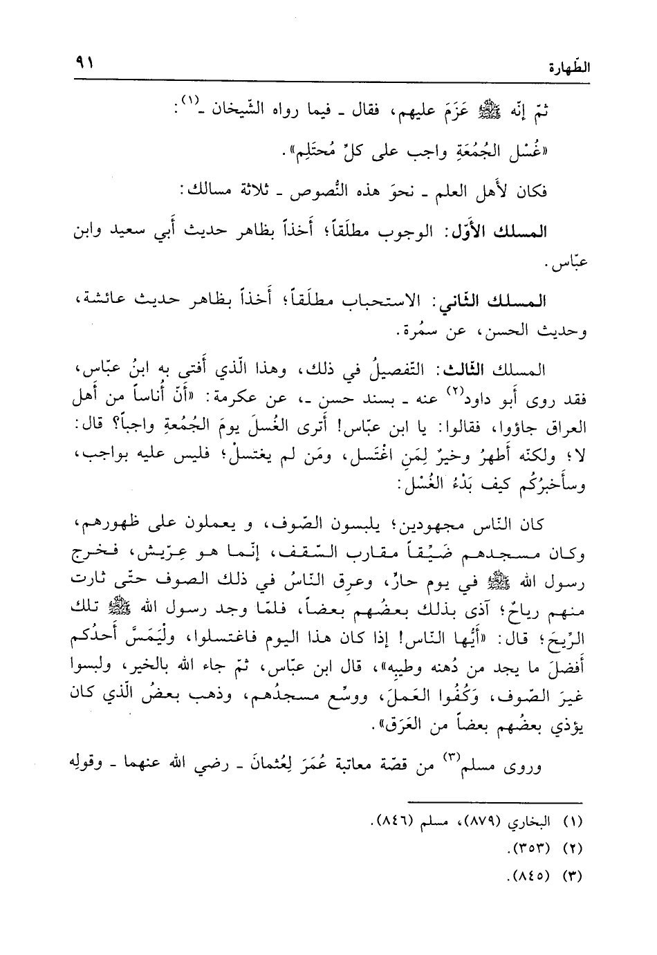 المسلك الثالث: التفصيلُ في ذلك، وهذا الّذي أَفتى به ابنُ عبَّاس، فقد روى أَبو داود (¬2) عنه -بسند حسن-، عن عكرمة: "أَن أُناسًا من أَهل العراق جاؤوا، فقالوا: يا ابن عبَّاس! أَترى الغُسلَ يومَ الجُمُعةِ واجبًا؟ قال: لا؛ ولكنّه أَطهرُ وخيرٌ لِمَنِ اغْتَسل، ومَن لم يغتسل؛ فليس عليه بواجب، وسأَخبرُكُم كيف بَدْءُ الغُسْل: