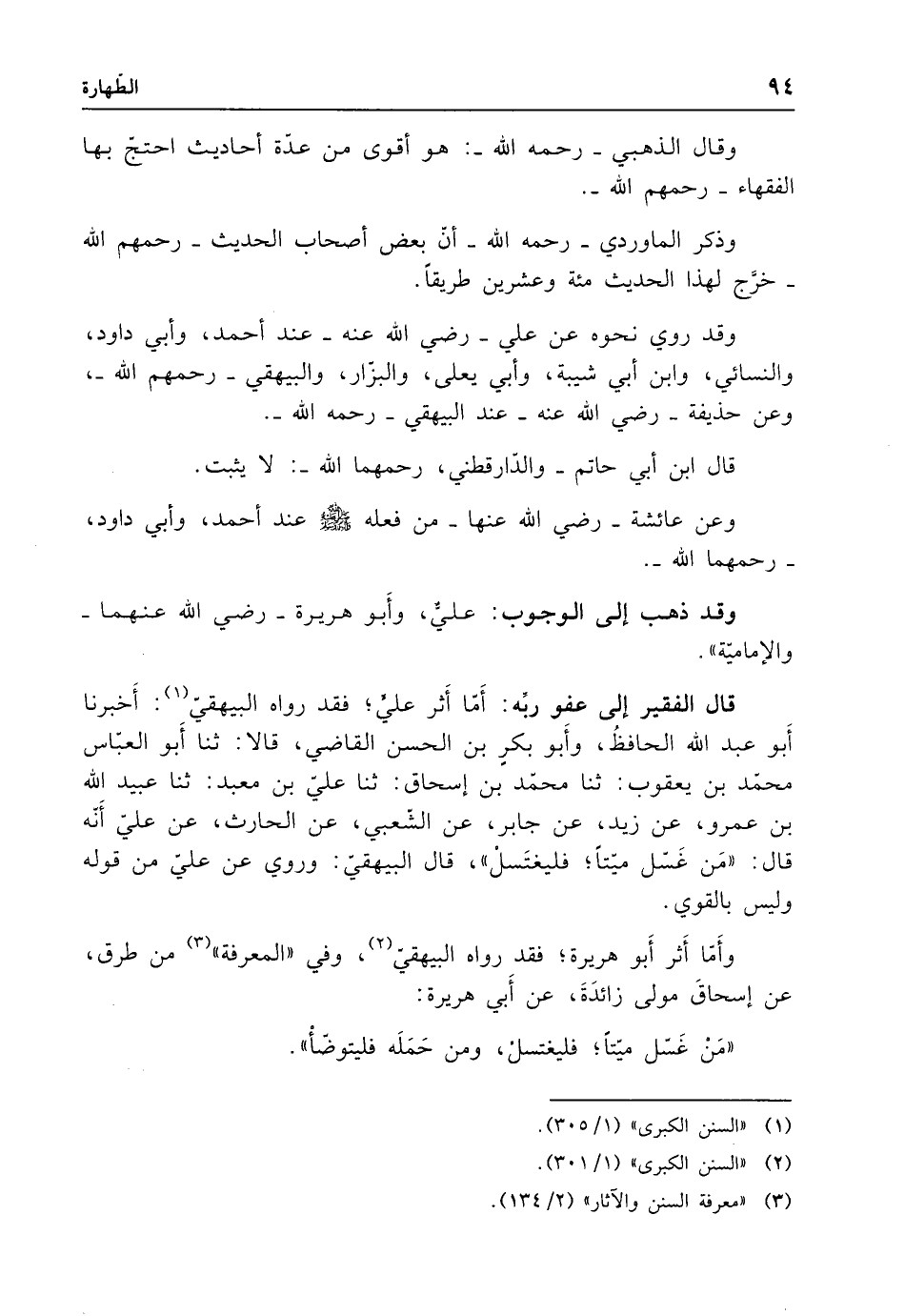 قال الفقير إلى عفو ربِّه: أَمَّا أَثر عليّ؛ فقد رواه البيهقي (¬1): أَخبرنا أَبو عبد الله الحافظُ، وأَبو بكرٍ بن الحسن القاضي، قالا: ثنا أَبو العبّاس محمد بن يعقوب: ثنا محمّد بن إسحاق: ثنا عليّ بن معبد: ثنا عبيد الله بن عمرو، عن زيد، عن جابر، عن الشعبي، عن الحارث، عن عليّ أَنه قال: "مَن غَسّل ميتًا؛ فليغتَسلْ"، قال البيهقيّ: وروي عن عليّ من قوله وليس بالقوي.
