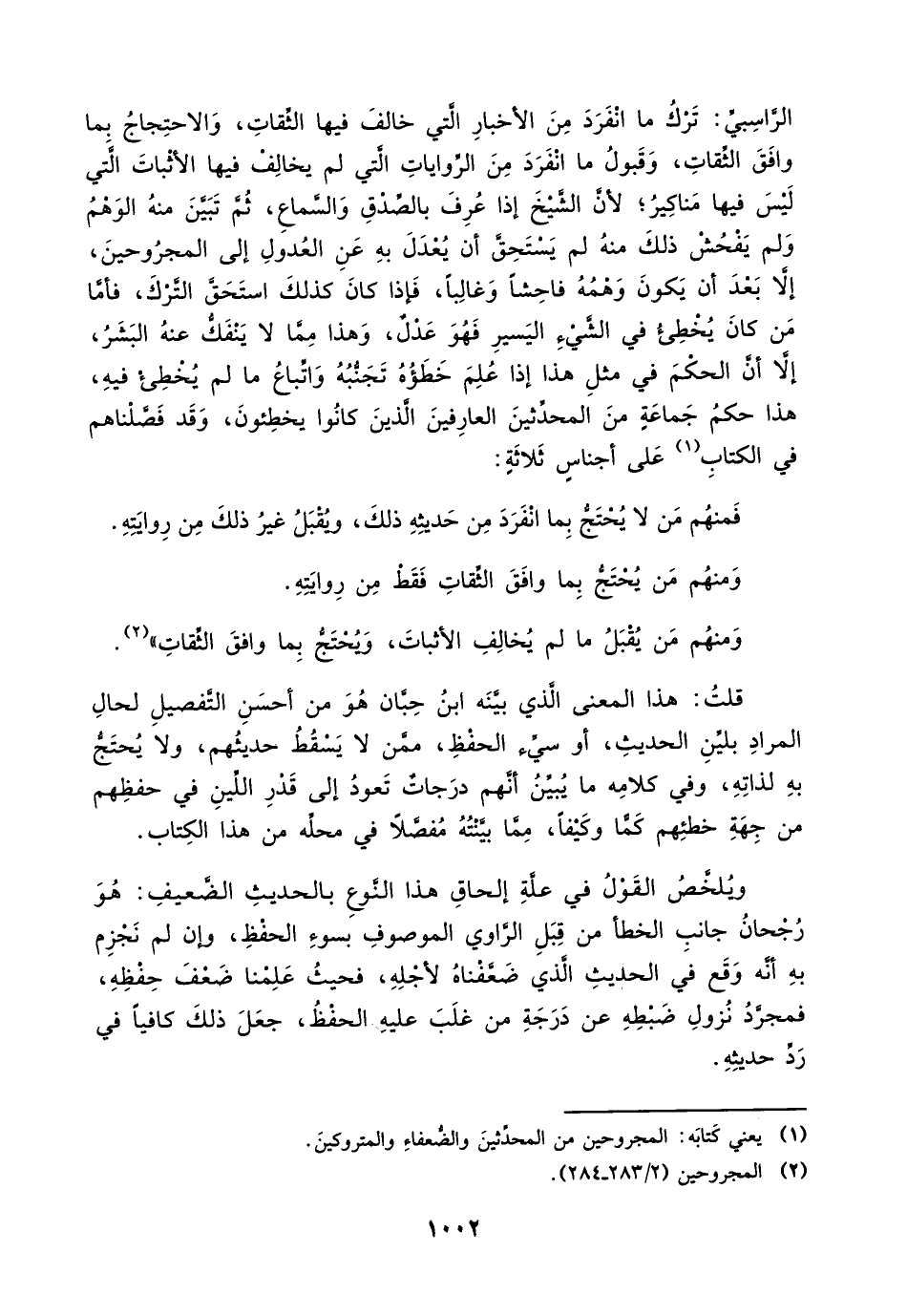 قلت: هذا المعنى الذي بينه ابن حبان هو من أحسن التفصيل لحال المراد بلين الحديث، أو سيء الحفظ، ممن لا يسقط حديثهم، ولا يحتج به لذاته، وفي كلامه ما يبين أنهم درجات تعود إلى قدر اللين في حفظهم من جهة خطئهم كما وكيفاً، مما بينته مفصلاً في محله من هذا الكتاب.
