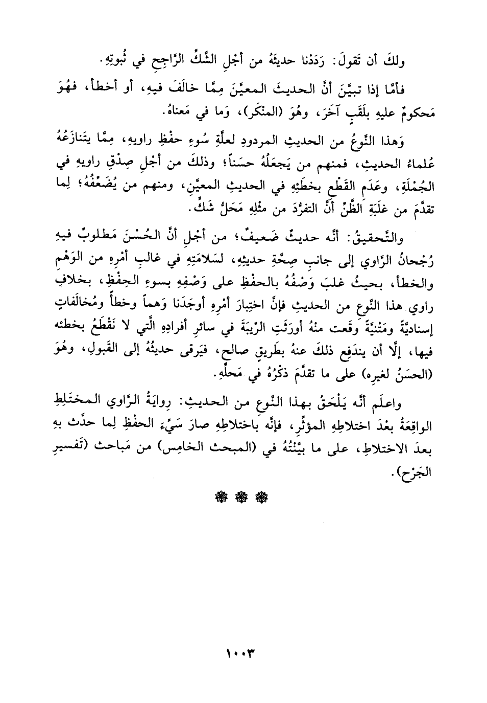 واعلم أنه يلحق بهذا النوع من الحديث: رواية الراوي المختلط الواقعة بعد اختلاطه المؤثر، فإنه باختلاطه صار سيء الحفظ لما حدث به بعد الاختلاط، على ما بينته في (المبحث الخامس) من مباحث (تفسير الجرح).