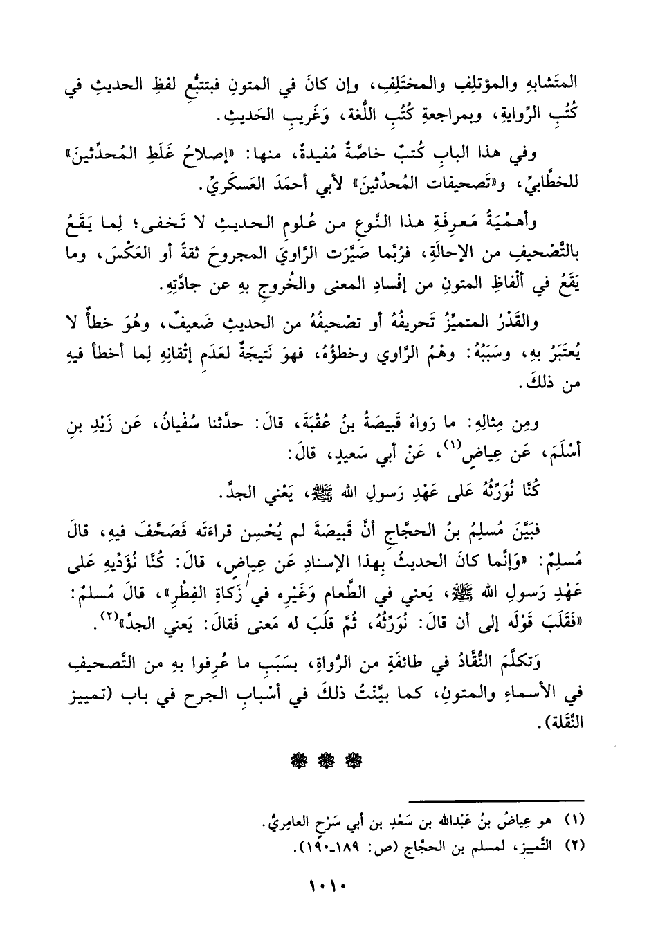 فبين مسلم بن الحجاج أن قبيصة لم يحسن قراءته فصحف فيه، قال مسلم: " وإنما كان الحديث بهذا الإسناد عن عياض، قال: كنا نؤديه على عهد رسول الله صلى الله عليه وسلم، يعني في الطعام وغيره في زكاة الفطر "، قال مسلم: " فقلب قوله إلى أن قال: نورثه، ثم قلب له معنى فقال: يعني الجد " (¬2).