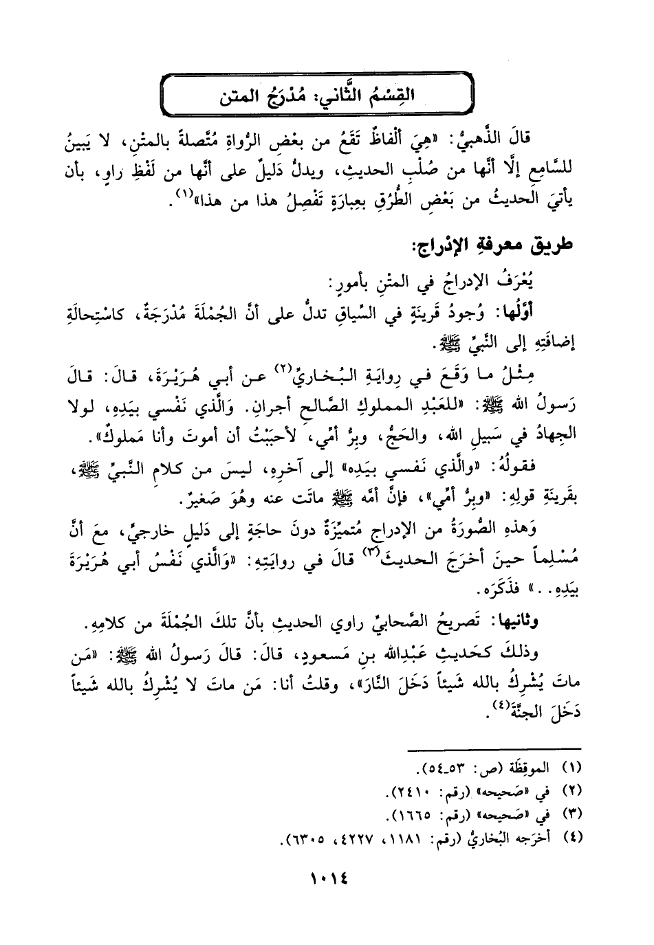 وهذه الصورة من الإدراج متميزة دون حاجة إلى دليل خارجي، مع أن مسلماً حين أخرج الحديث (¬3) قال في روايته: " والذي نفس أبي هريرة بيده. . " فذكره.