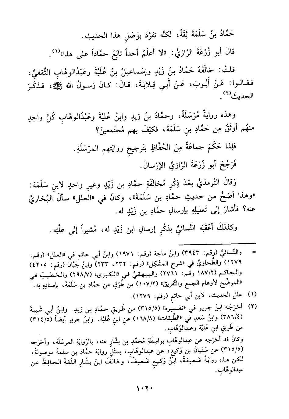 وهذه رواية مرسلة، وحماد بن زيد وابن علية وعبد الوهاب كل واحد منهم أوثق من حماد بن سلمة، فكيف بهم مجتمعين؟.
