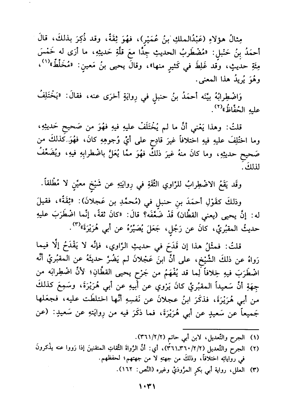 (¬2) الجرح والتعديل (2/ 2 / 360 _ 361)، أي: أنَّ الرواة الثقات المتقنين إذا رووا عنه يذْكرون في رواياته اختلافاً، وذلك من جهته لا من جهتهم؛ لحفظهم.