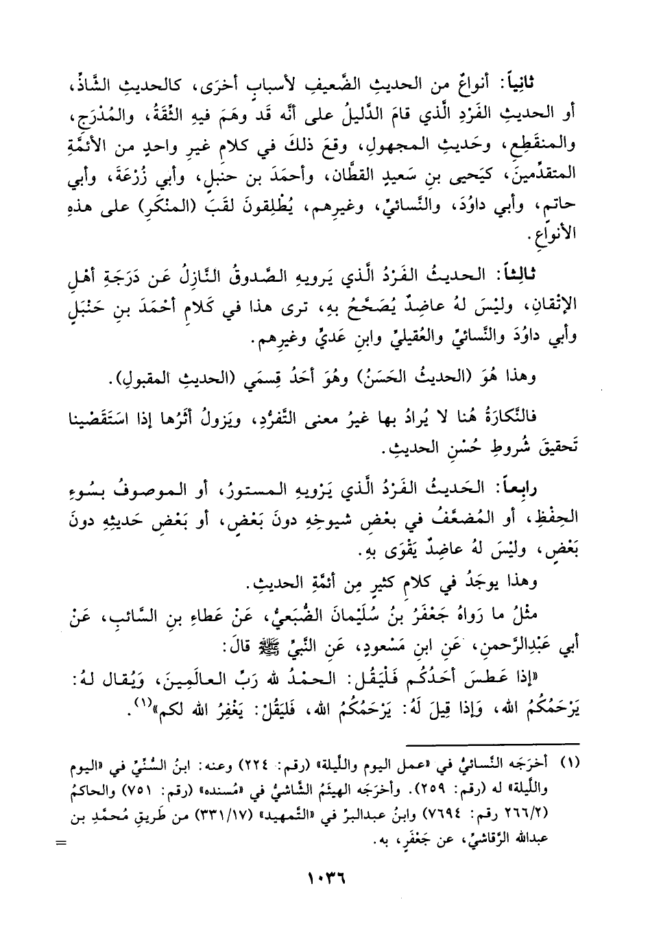 ثانياً: أنواع من الحديث الضعيف لأسباب أخرى، كالحديث الشاذ، أو الحديث الفرد الذي قام الدليل على أنه قد وهم فيه الثقة، والمدرج، والمنقطع، وحديث المجهول، وقع ذلك في كلام غير واحد من الأئمة المتقدمين، كيحيى بن سعيد القطان، وأحمد بن حنبل، وأبي زرعة، وأبي حاتم، وأبي داود، والنسائي، وغيرهم، يطلقون لقب (المنكر) على هذه الأنواع.