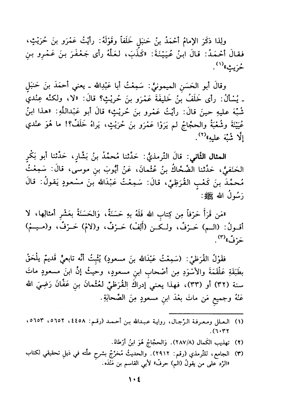 ولذا ذكر الإمام أحمد بن حنبل خلفاً وقوله رأيت عمرو بن حريث، فقال أحمد: قال ابن عيينة: " كذب، لعله رأى جعفر بن عمرو بن حريث " (¬1).