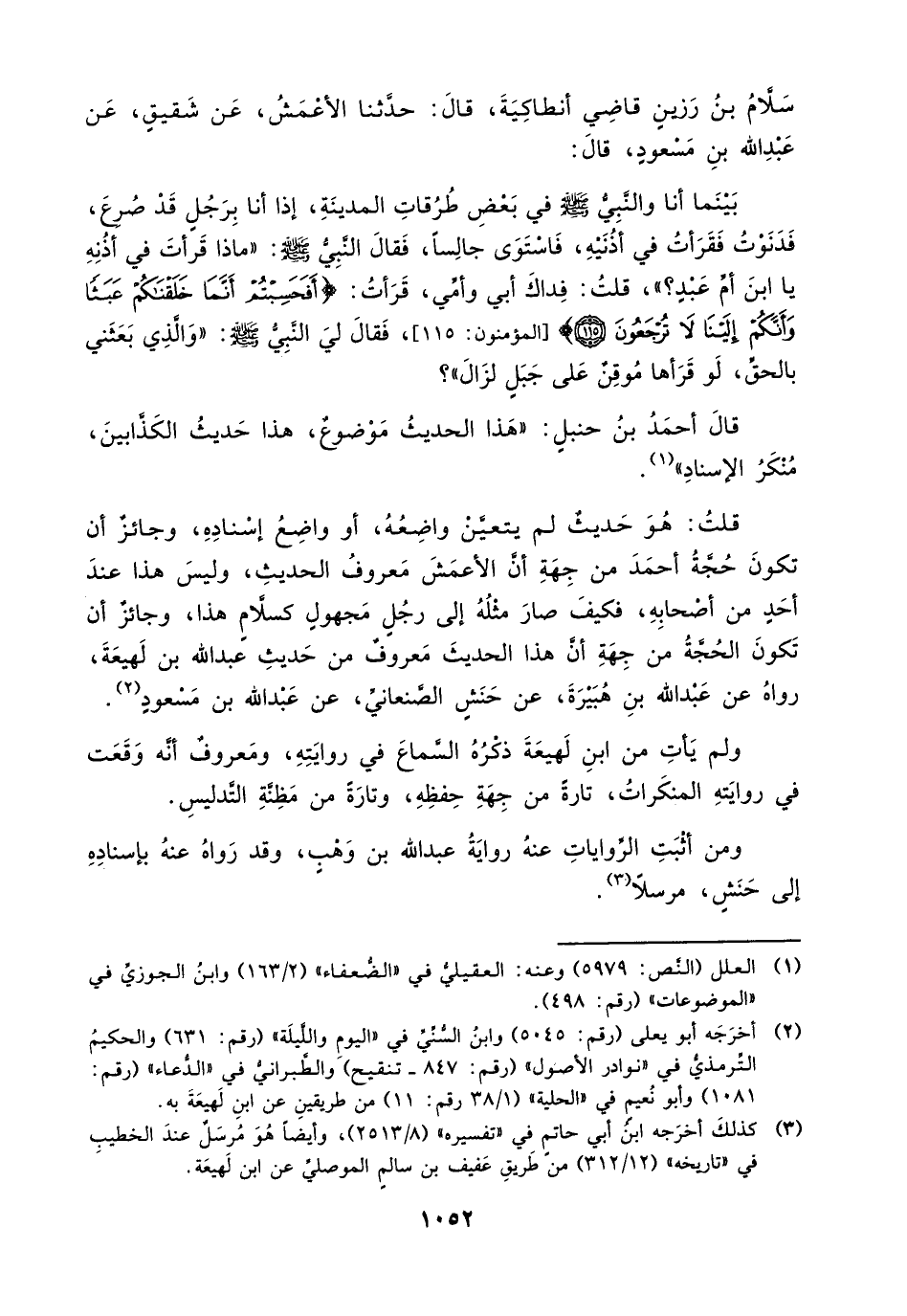 قلت: هو حديث لم يتعين واضعه، أو واضع إسناده، وجائز أن تكون حجة أحمد من جهة أن الأعمش معروف الحديث، وليس هذا عند أحد من أصحابه، فكيف صار مثله إلى رجل مجهول كسلام هذا، وجائز أن تكون الحجة أن الحديث معروف من حديث عبد الله بن لهيعة، رواه عن عبد الله بن هبيرة، عن حنش الصنعاني، عن عبد الله بن مسعود (¬2).