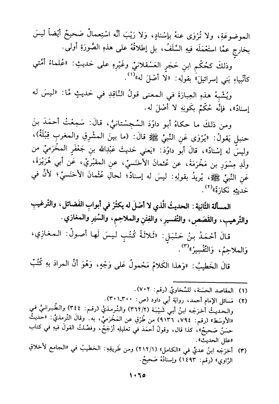 المسألة الثانية: الحديث الذي لا أصل له يكثر في أبواب الفضائل، والترغيب والترهيب، والقصص، والتفسير، والفتن والملاحم، والسير والمغازي.