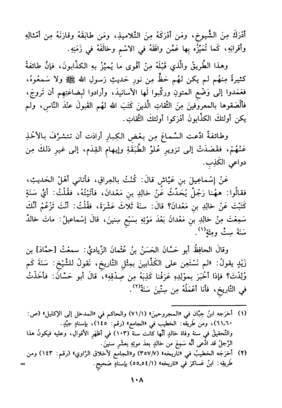 وهذا الطريق والذي قبله من أقوى ما يميز به الكذابون، فإن طائفة كثيرة منهم لم يكن لهم حظ من نور حديث رسول الله صلى الله عليه وسلم ولا سمعوه، فعمدوا إلى وضع المتون وركَّبوا لها الأسانيد، وأرادوا لبضاعتهم أن تروج، فألصقوها بالمعروفين من الثقات الذين كتب الله لهم القبول عند الناس، ولم يكن أولئك الكذابون أدركوا أولئك الثقات.