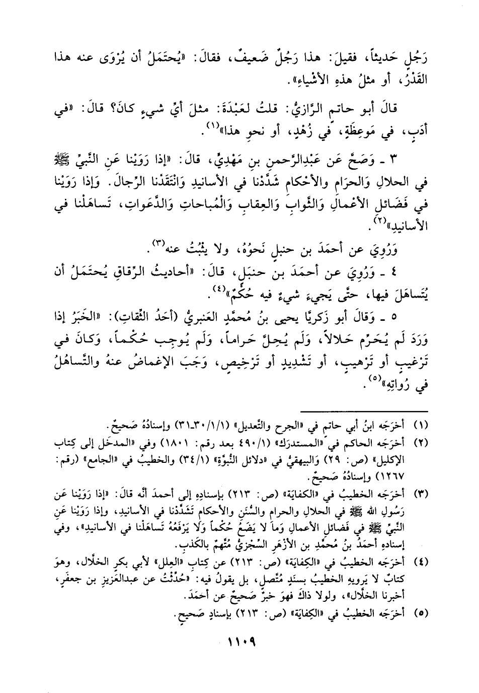 (¬3) أخرجه الخطيب في " الكفاية " (ص: 213) بإسناده إلى أحمد أنه قال: " إذا روينا عن رسول الله صلى الله عليه وسلم في الحلال والحرام والسنن والأحكام تشددنا في الأسانيد، وإذا روينا عن النبي صلى الله عليه وسلم في فضائل الأعمال وما لا يَضع حُكماً ولا يَرفعه تساهلنا في الأسانيد "، وفي إسناده أحمد بن مُحمد بن الأزهر السجزي مُتهم بالكذب.