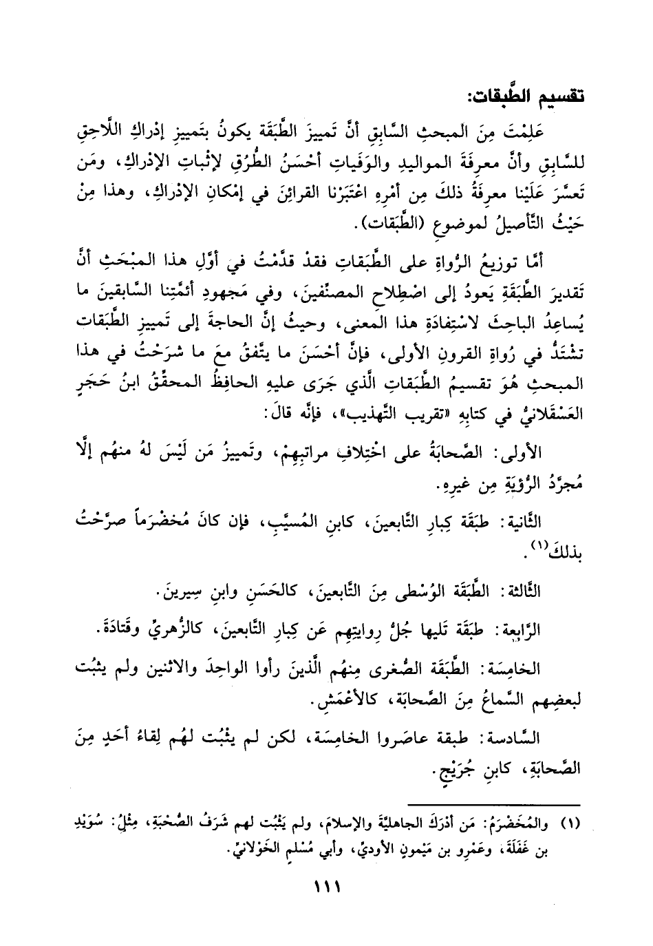 أما توزيع الرواة على الطبقات فقد قدمت في أول هذا المبحث أن تقدير الطبقة يعود إلى اصطلاح المصنفين، وفي مجهود أئمتنا السابقين ما يساعد الباحث لاستفادة هذا المعنى، وحيث إن الحاجة إلى تمييز الطبقات تشتد في رواة القرون الأولى، فإن أحسن ما يتفق مع ما شرحت في هذا المبحث هو تقسيم الطبقات الذي جرى عليه الحافظ المحقق ابن حجر العسقلاني في كتابه " تقريب التهذيب "، فإنه قال: