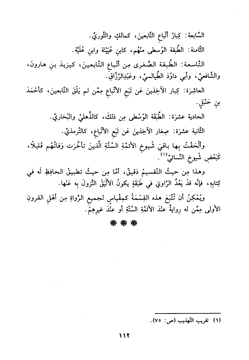 التاسعة: الطبقة الصغرى من أتباع التابعين، كيزيد بن هارون، والشافعي، وأبي داود الطيالسي، وعبد الرزاق.