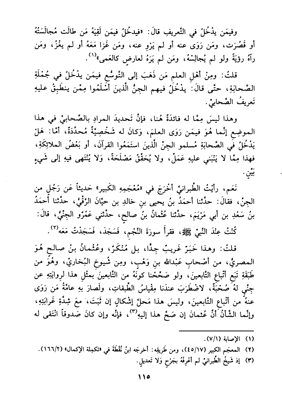 قلت: وهذا خبر غريب جداً، بل منكر، وعثمان بن صالح هو المصري، من أصحاب عبد الله بن وهب، ومن شيوخ البخاري، وهو من طبقة تبع أتباع التابعين، ولو صححنا كونه من التابعين بمثل هذا لروايته عن جني له صحبة، لاضطرب عندنا مقياس الطبقات، ولصار به عامة من روى عنه من أتباع التابعين، وليس هذا محل إشكال إن ثبت، مع شدة غرابته، وإنما الشأن أن عثمان إن صح هذا إليه (¬3)، فإنه وإن كان صدوقاً انتقى له