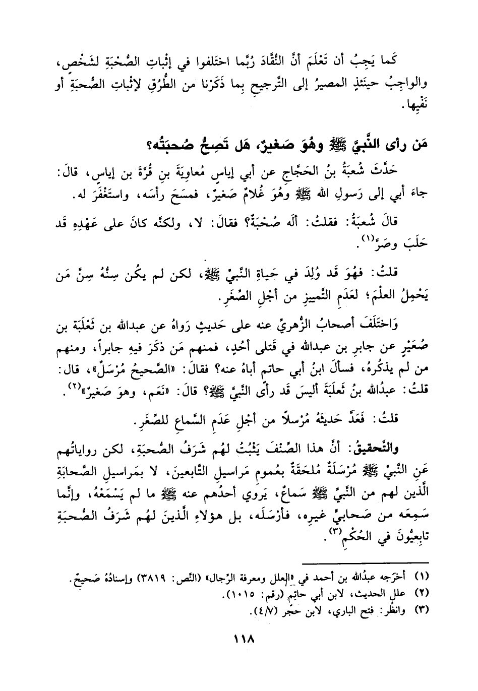 والتحقيق: أن هذا الصنف يثبت لهم شرف الصحبة، لكن رواياتهم عن النبي صلى الله عليه وسلم مرسلة ملحقة بعموم مراسيل التابعين، لا بمراسيل الصحابة الذين لهم من النبي صلى الله عليه وسلم سماع، يروي أحدهم عنه صلى الله عليه وسلم ما لم يسمعه، وإنما سمعه من صحابي غيره، فأرسله، بل هؤلاء الذين لهم شرف الصحبة تابعيون في الحكم (¬3).