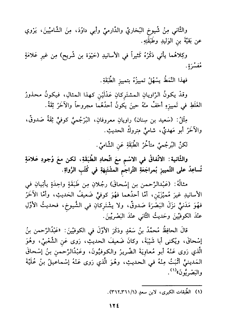 والثانية: الاتفاق في الاسم مع اتحاد الطبقة، لكن مع وجود علامة تساعد على التمييز بمراجعة التراجم المشتبه في كتب الرواة.