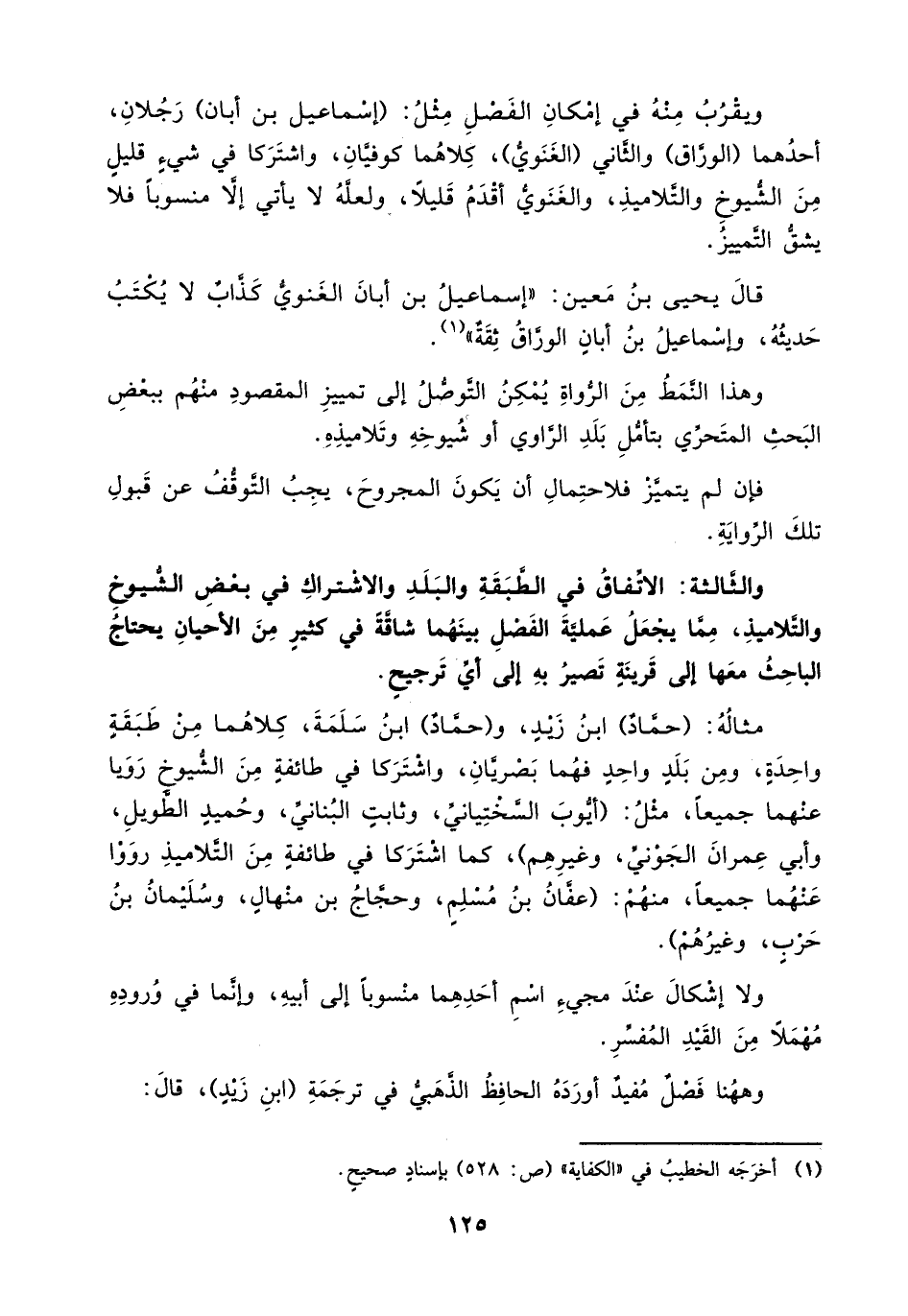 ويقرب منه في إمكان الفصل مثل: (إسماعيل بن أبان) رجلان، أحدهما (الوراق) والثاني (الغنوي)، كلاهما كوفيان، واشتركا في شيء قليل من الشيوخ والتلاميذ، والغنوي أقدم قليلاً، ولعله لا يأتي إلا منسوباً فلا يشق التمييز.