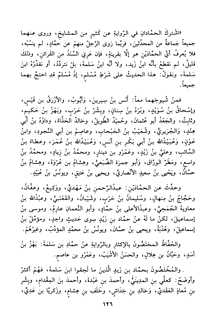 " اشتركا الحمادان في الرواية عن كثير من المشايخ، وروى عنهما جميعاً جماعة من المحدثين، فربما روى الرجل منهم عن حماد، لم ينسبه، فلا يعرف أي الحمادين هو إلا بقرينة، فإن عري السند من القرائن، وذلك قليل، لم نقطع بأنه ابن زيد، ولا أنه ابن سلمة، بل نتردد، أو تقدره ابن سلمة، ونقول: هذا الحديث على شرط مسلم، إذ مسلم قد احتج بهما جميعاً.