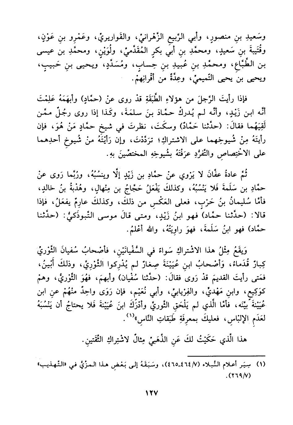 فإذا رأيت الرجل من هؤلاء الطبقة قد روى عن (حماد) وأبهمه علمت أنه ابن زيد، وأنه لم يدرك حماد بن سلمة، وكذا إذا روى رجل ممن لقيهما فقال: (حدثنا حماد) وسكت، نظرت في شيخ حماد من هو، فإن رأيته من شيوخهما على الاشتراك؛ ترددت، وإن رأيته من شيوخ أحدهما على الاختصاص والتفرد عرفته بشيوخه المختصين به.